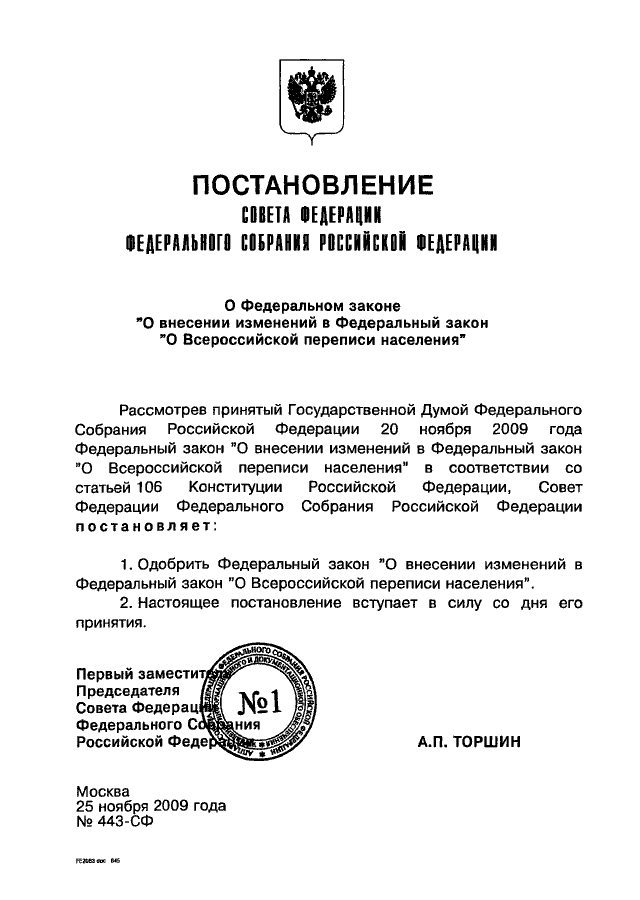 ПОСТАНОВЛЕНИЕ СФ ФС РФ от 25.11.2009 N 443-СФ