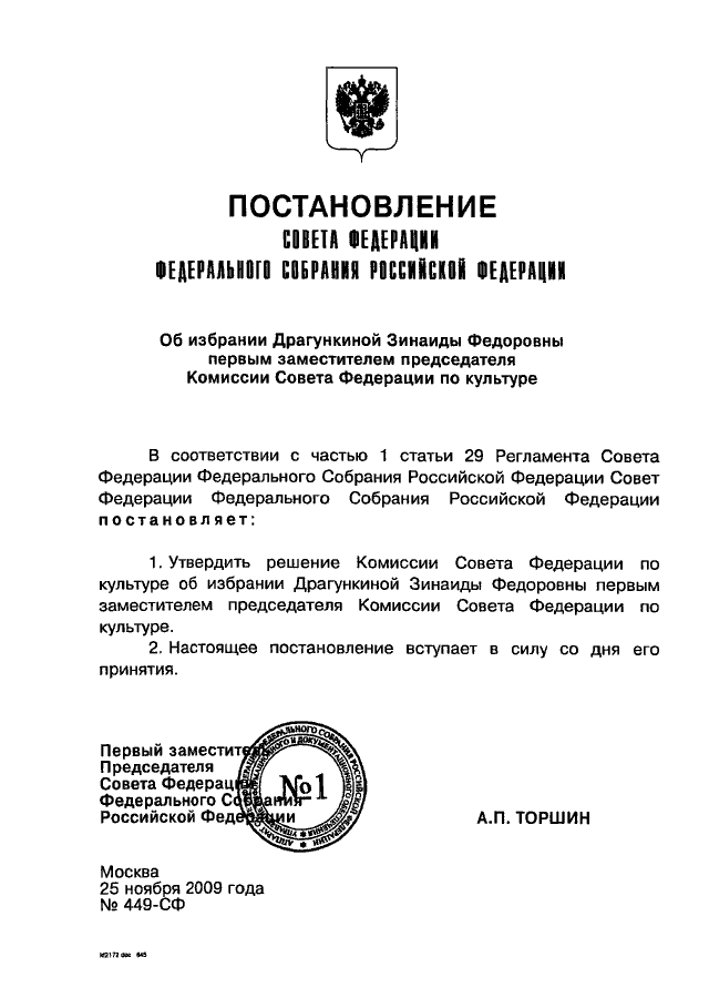 "ОБ ИЗБРАНИИ ДРАГУНКИНОЙ ЗИНАИДЫ ФЕДОРОВНЫ ПЕРВЫМ ЗАМЕСТИТЕЛЕМ ПРЕДСЕДАТЕЛЯ КОМИССИИ СОВЕТА ФЕДЕРАЦИИ ПО КУЛЬТУРЕ"