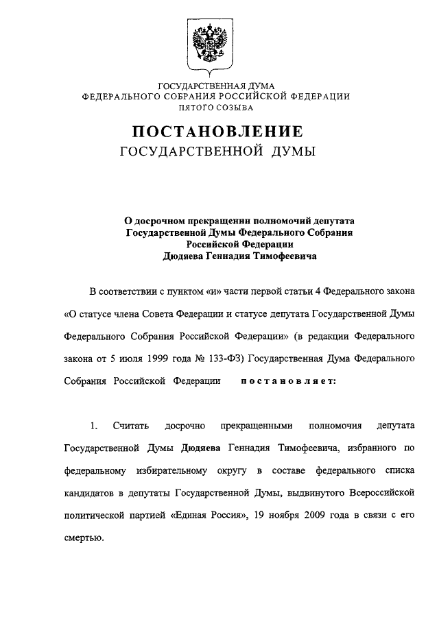 "О ДОСРОЧНОМ ПРЕКРАЩЕНИИ ПОЛНОМОЧИЙ ДЕПУТАТА ГОСУДАРСТВЕННОЙ ДУМЫ ФЕДЕРАЛЬНОГО СОБРАНИЯ РОССИЙСКОЙ ФЕДЕРАЦИИ ДЮДЯЕВА ГЕННАДИЯ ТИМОФЕЕВИЧА"
