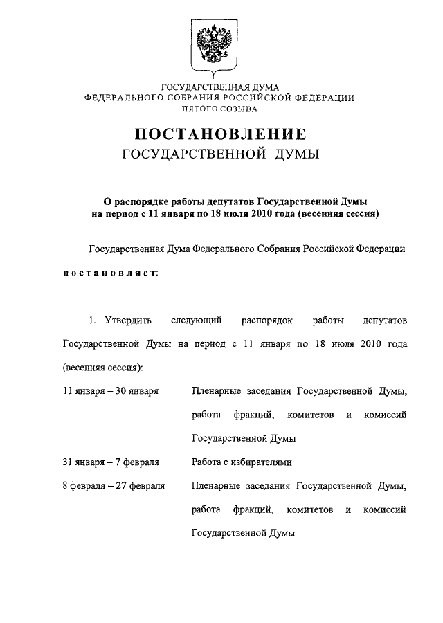 "О РАСПОРЯДКЕ РАБОТЫ ДЕПУТАТОВ ГОСУДАРСТВЕННОЙ ДУМЫ НА ПЕРИОД С 11 ЯНВАРЯ ПО 18 ИЮЛЯ 2010 ГОДА (ВЕСЕННЯЯ СЕССИЯ)"