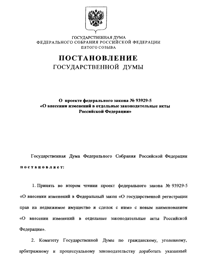 "О ПРОЕКТЕ ФЕДЕРАЛЬНОГО ЗАКОНА N 93929-5 "О ВНЕСЕНИИ ИЗМЕНЕНИЙ В ОТДЕЛЬНЫЕ ЗАКОНОДАТЕЛЬНЫЕ АКТЫ РОССИЙСКОЙ ФЕДЕРАЦИИ"