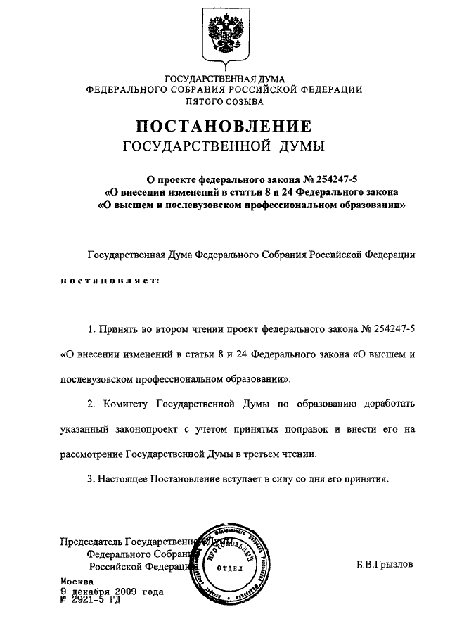 ПОСТАНОВЛЕНИЕ ГД ФС РФ от 09.12.2009 N 2921-5 ГД