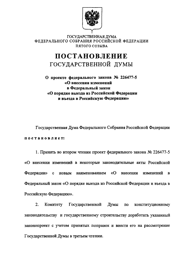 "О ПРОЕКТЕ ФЕДЕРАЛЬНОГО ЗАКОНА N 226477-5 "О ВНЕСЕНИИ ИЗМЕНЕНИЙ В ФЕДЕРАЛЬНЫЙ ЗАКОН "О ПОРЯДКЕ ВЫЕЗДА ИЗ РОССИЙСКОЙ ФЕДЕРАЦИИ И ВЪЕЗДА В РОССИЙСКУЮ ФЕДЕРАЦИЮ"