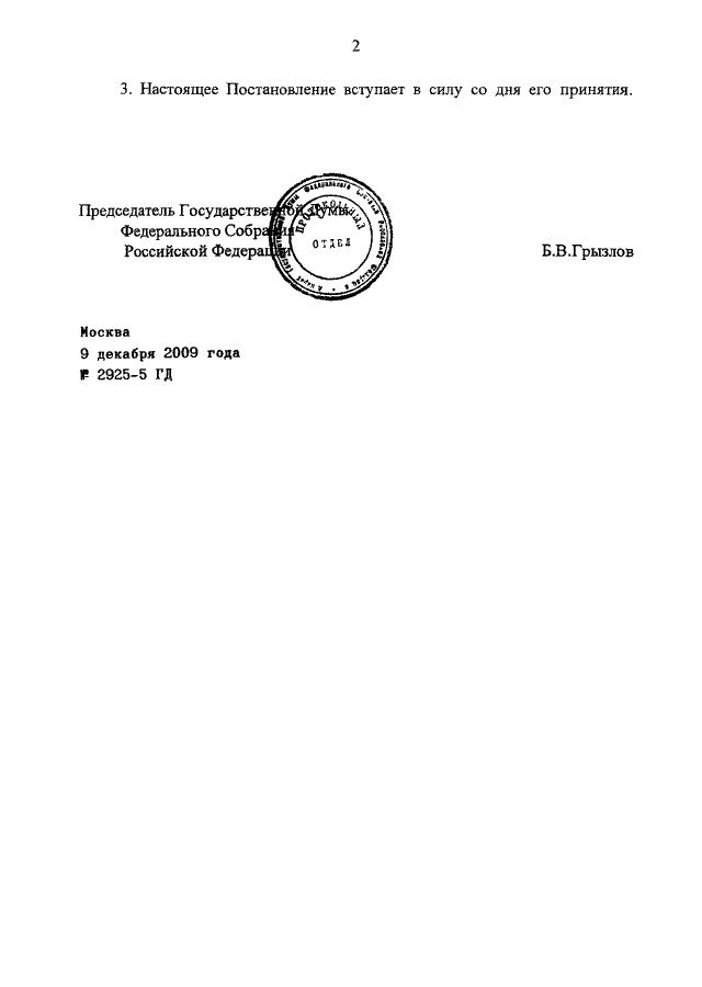 ПОСТАНОВЛЕНИЕ ГД ФС РФ от 09.12.2009 N 2925-5 ГД