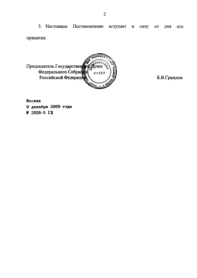 ПОСТАНОВЛЕНИЕ ГД ФС РФ от 09.12.2009 N 2926-5 ГД