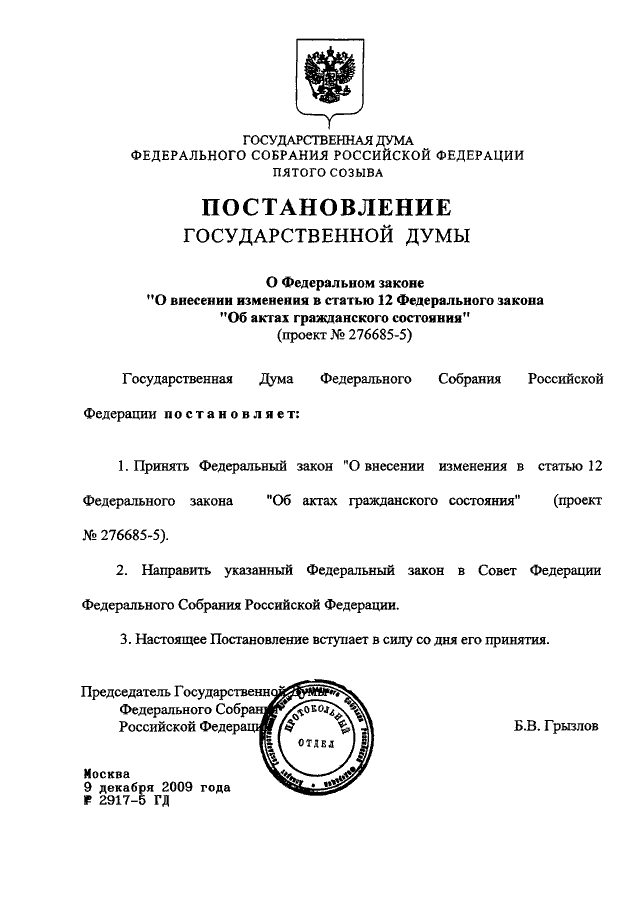"О ФЕДЕРАЛЬНОМ ЗАКОНЕ "О ВНЕСЕНИИ ИЗМЕНЕНИЯ В СТАТЬЮ 12 ФЕДЕРАЛЬНОГО ЗАКОНА "ОБ АКТАХ ГРАЖДАНСКОГО СОСТОЯНИЯ" (ПРОЕКТ N 276685-5)"
