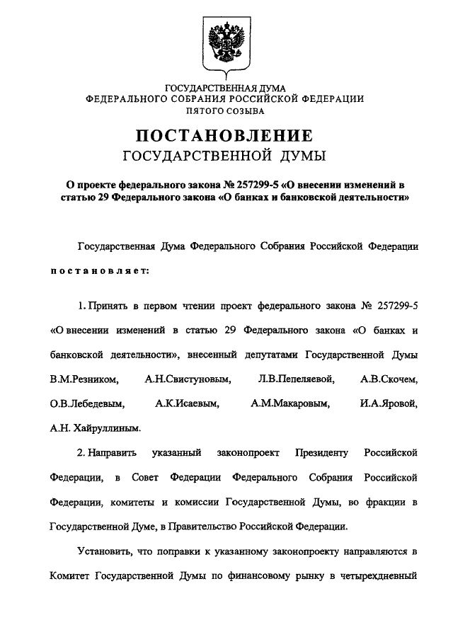 "О ПРОЕКТЕ ФЕДЕРАЛЬНОГО ЗАКОНА N 257299-5 "О ВНЕСЕНИИ ИЗМЕНЕНИЙ В СТАТЬЮ 29 ФЕДЕРАЛЬНОГО ЗАКОНА "О БАНКАХ И БАНКОВСКОЙ ДЕЯТЕЛЬНОСТИ"