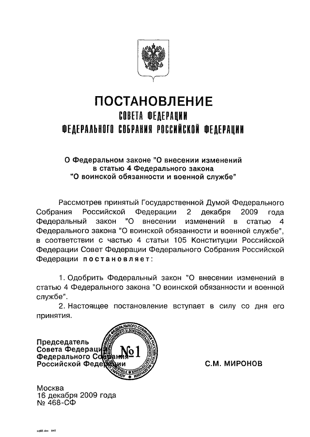 ПОСТАНОВЛЕНИЕ СФ ФС РФ от 16.12.2009 N 468-СФ