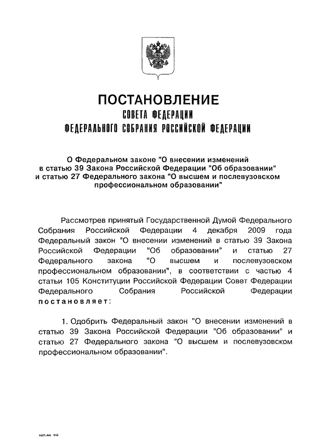 "О ФЕДЕРАЛЬНОМ ЗАКОНЕ "О ВНЕСЕНИИ ИЗМЕНЕНИЙ В СТАТЬЮ 39 ЗАКОНА РОССИЙСКОЙ ФЕДЕРАЦИИ "ОБ ОБРАЗОВАНИИ" И СТАТЬЮ 27 ФЕДЕРАЛЬНОГО ЗАКОНА "О ВЫСШЕМ И ПОСЛЕВУЗОВСКОМ ПРОФЕССИОНАЛЬНОМ ОБРАЗОВАНИИ"