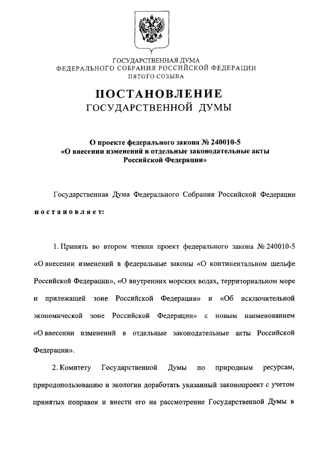 "О ПРОЕКТЕ ФЕДЕРАЛЬНОГО ЗАКОНА N 240010-5 "О ВНЕСЕНИИ ИЗМЕНЕНИЙ В ОТДЕЛЬНЫЕ ЗАКОНОДАТЕЛЬНЫЕ АКТЫ РОССИЙСКОЙ ФЕДЕРАЦИИ"