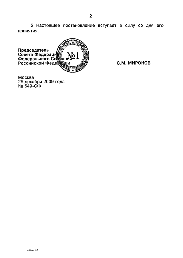 ПОСТАНОВЛЕНИЕ СФ ФС РФ от 25.12.2009 N 549-СФ