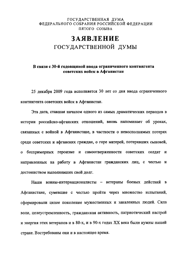 "О ЗАЯВЛЕНИИ ГОСУДАРСТВЕННОЙ ДУМЫ ФЕДЕРАЛЬНОГО СОБРАНИЯ РОССИЙСКОЙ ФЕДЕРАЦИИ "В СВЯЗИ С 30-Й ГОДОВЩИНОЙ ВВОДА ОГРАНИЧЕННОГО КОНТИНГЕНТА СОВЕТСКИХ ВОЙСК В АФГАНИСТАН"
