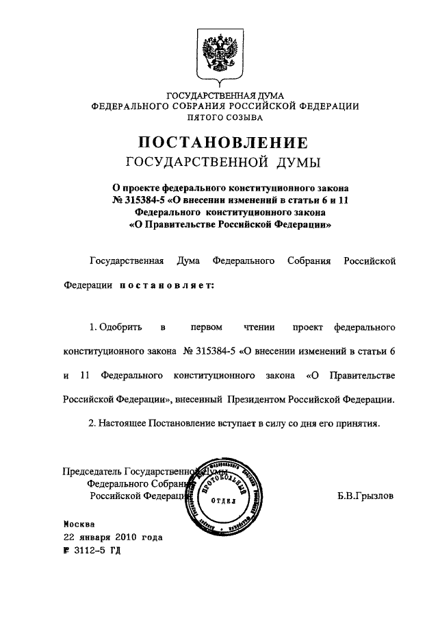 ПОСТАНОВЛЕНИЕ ГД ФС РФ от 22.01.2010 N 3112-5 ГД