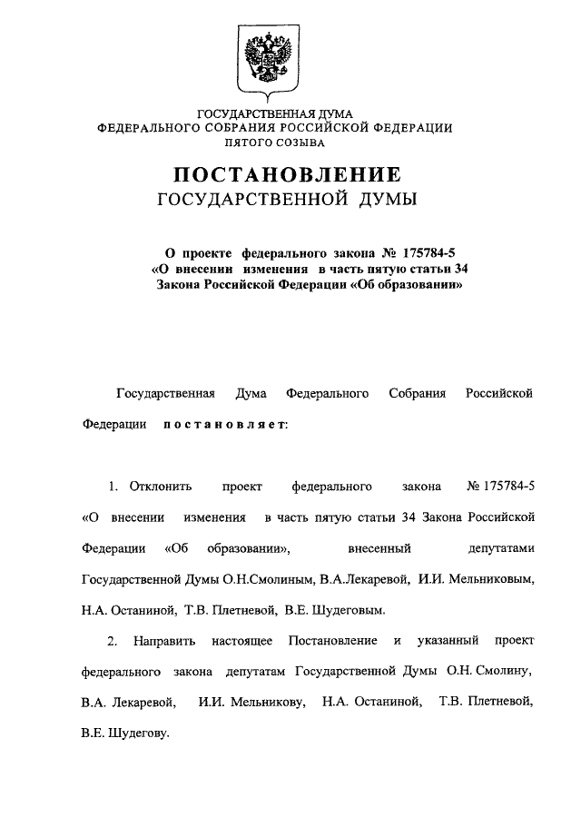 "О ПРОЕКТЕ ФЕДЕРАЛЬНОГО ЗАКОНА N 175784-5 "О ВНЕСЕНИИ ИЗМЕНЕНИЯ В ЧАСТЬ ПЯТУЮ СТАТЬИ 34 ЗАКОНА РОССИЙСКОЙ ФЕДЕРАЦИИ "ОБ ОБРАЗОВАНИИ"