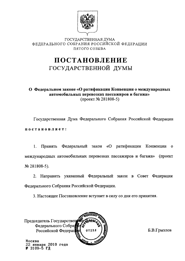 "О ФЕДЕРАЛЬНОМ ЗАКОНЕ "О РАТИФИКАЦИИ КОНВЕНЦИИ О МЕЖДУНАРОДНЫХ АВТОМОБИЛЬНЫХ ПЕРЕВОЗКАХ ПАССАЖИРОВ И БАГАЖА" (ПРОЕКТ N 281808-5)"