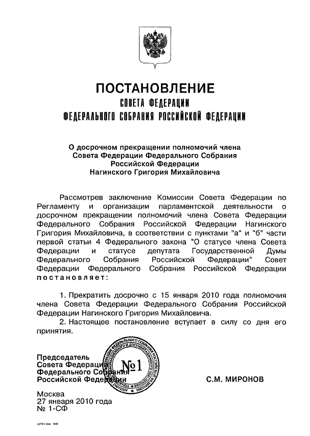 "О ДОСРОЧНОМ ПРЕКРАЩЕНИИ ПОЛНОМОЧИЙ ЧЛЕНА СОВЕТА ФЕДЕРАЦИИ ФЕДЕРАЛЬНОГО СОБРАНИЯ РОССИЙСКОЙ ФЕДЕРАЦИИ НАГИНСКОГО ГРИГОРИЯ МИХАЙЛОВИЧА"