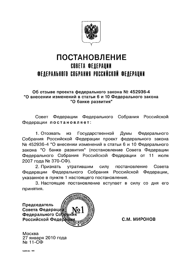 ПОСТАНОВЛЕНИЕ СФ ФС РФ от 27.01.2010 N 11-СФ