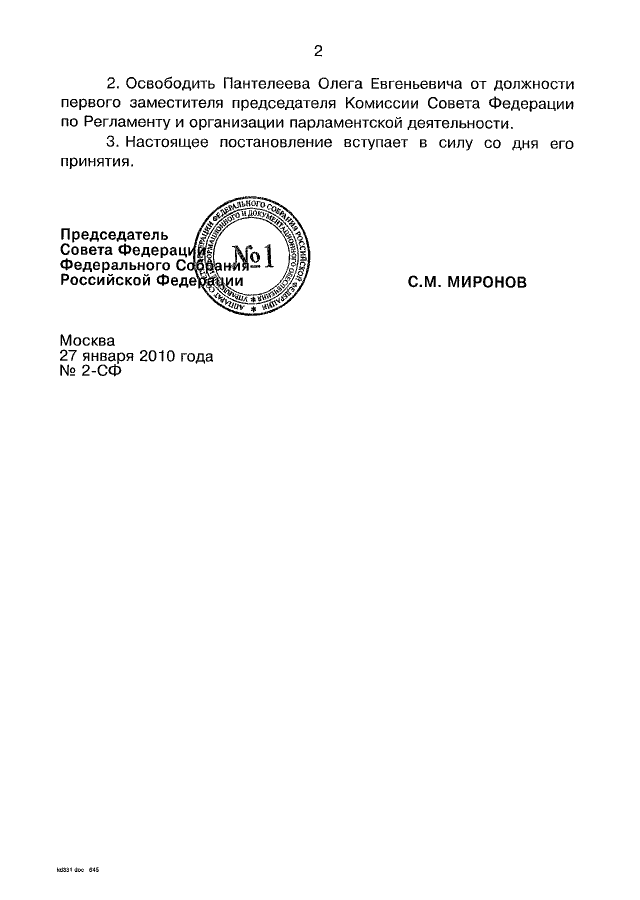 ПОСТАНОВЛЕНИЕ СФ ФС РФ от 27.01.2010 N 2-СФ