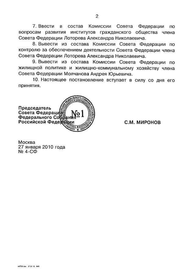 ПОСТАНОВЛЕНИЕ СФ ФС РФ от 27.01.2010 N 4-СФ