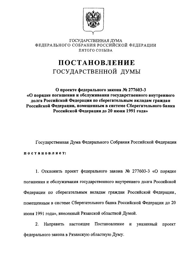 "О ПРОЕКТЕ ФЕДЕРАЛЬНОГО ЗАКОНА N 277603-3 "О ПОРЯДКЕ ПОГАШЕНИЯ И