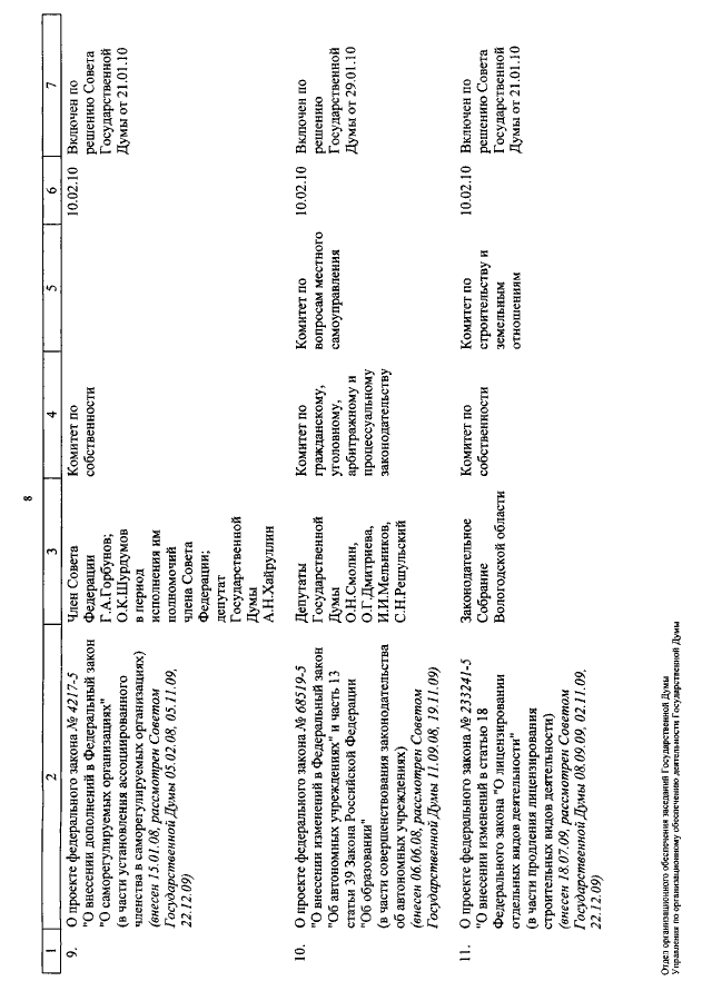 "О КАЛЕНДАРЕ РАССМОТРЕНИЯ ВОПРОСОВ ГОСУДАРСТВЕННОЙ ДУМОЙ С 10 ПО 26 ФЕВРАЛЯ 2010 ГОДА"