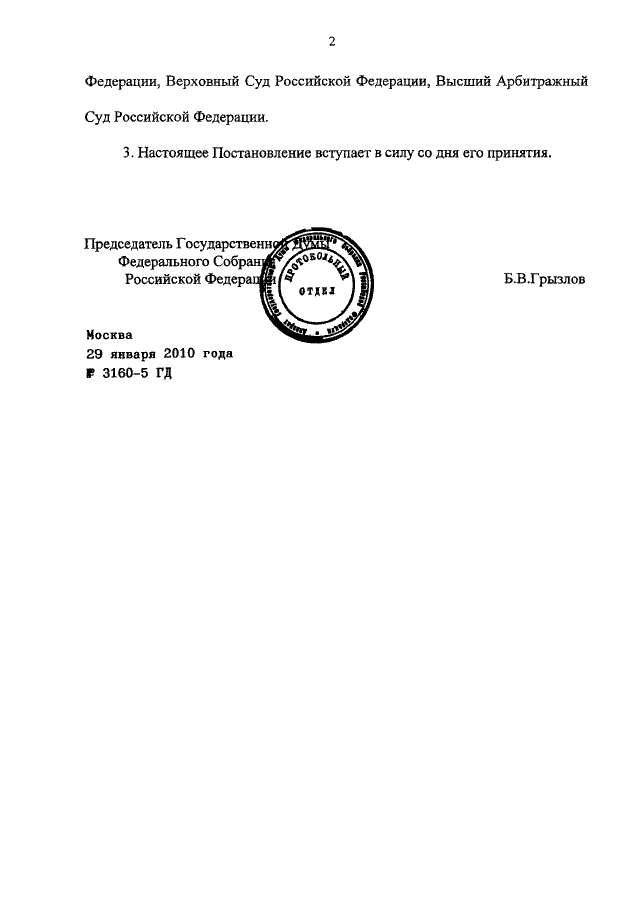 ПОСТАНОВЛЕНИЕ ГД ФС РФ от 29.01.2010 N 3160-5 ГД