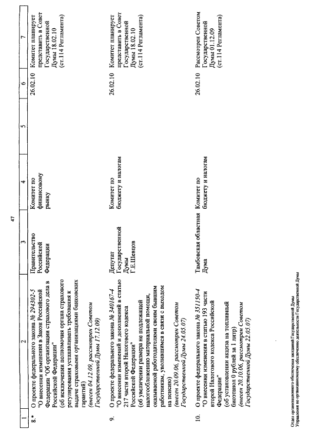 "О КАЛЕНДАРЕ РАССМОТРЕНИЯ ВОПРОСОВ ГОСУДАРСТВЕННОЙ ДУМОЙ С 10 ПО 26 ФЕВРАЛЯ 2010 ГОДА"