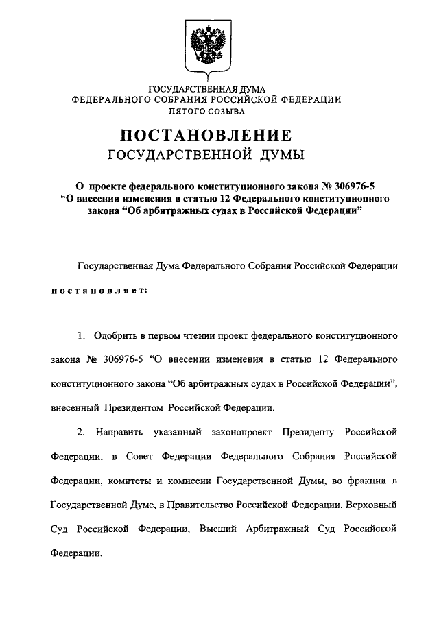 "О ПРОЕКТЕ ФЕДЕРАЛЬНОГО КОНСТИТУЦИОННОГО ЗАКОНА N 306976-5 "О ВНЕСЕНИИ ИЗМЕНЕНИЯ В СТАТЬЮ 12 ФЕДЕРАЛЬНОГО КОНСТИТУЦИОННОГО ЗАКОНА "ОБ АРБИТРАЖНЫХ СУДАХ В РОССИЙСКОЙ ФЕДЕРАЦИИ"