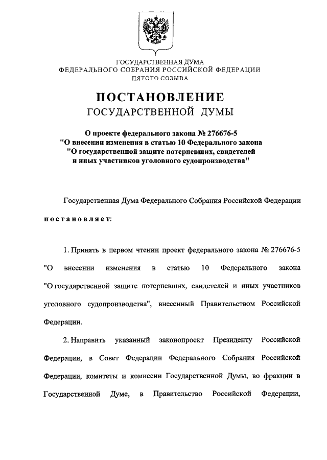 "О ПРОЕКТЕ ФЕДЕРАЛЬНОГО ЗАКОНА N 276676-5 "О ВНЕСЕНИИ ИЗМЕНЕНИЯ В СТАТЬЮ 10 ФЕДЕРАЛЬНОГО ЗАКОНА "О ГОСУДАРСТВЕННОЙ ЗАЩИТЕ ПОТЕРПЕВШИХ, СВИДЕТЕЛЕЙ И ИНЫХ УЧАСТНИКОВ УГОЛОВНОГО СУДОПРОИЗВОДСТВА"
