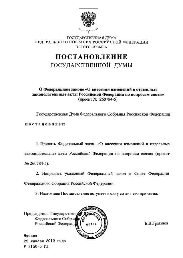 ПОСТАНОВЛЕНИЕ ГД ФС РФ от 29.01.2010 N 3156-5 ГД