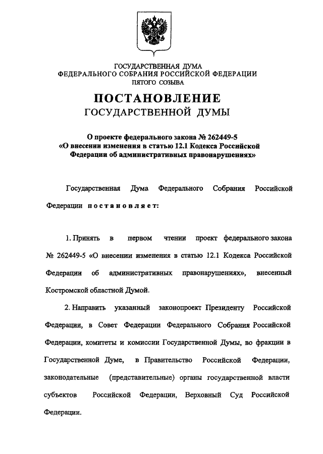 "О ПРОЕКТЕ ФЕДЕРАЛЬНОГО ЗАКОНА N 262449-5 "О ВНЕСЕНИИ ИЗМЕНЕНИЯ В СТАТЬЮ 12.1 КОДЕКСА РОССИЙСКОЙ ФЕДЕРАЦИИ ОБ АДМИНИСТРАТИВНЫХ ПРАВОНАРУШЕНИЯХ"