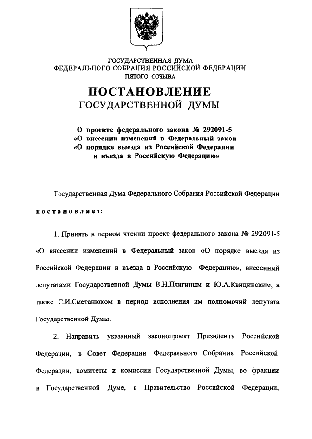 "О ПРОЕКТЕ ФЕДЕРАЛЬНОГО ЗАКОНА N 292091-5 "О ВНЕСЕНИИ ИЗМЕНЕНИЙ В ФЕДЕРАЛЬНЫЙ ЗАКОН "О ПОРЯДКЕ ВЫЕЗДА ИЗ РОССИЙСКОЙ ФЕДЕРАЦИИ И ВЪЕЗДА В РОССИЙСКУЮ ФЕДЕРАЦИЮ"