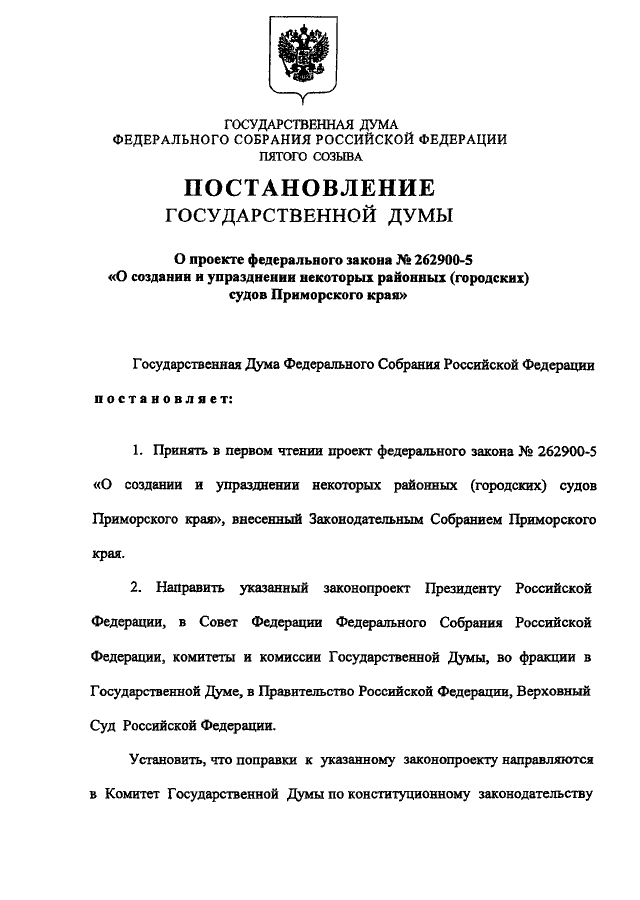 "О ПРОЕКТЕ ФЕДЕРАЛЬНОГО ЗАКОНА N 262900-5 "О СОЗДАНИИ И УПРАЗДНЕНИИ НЕКОТОРЫХ РАЙОННЫХ (ГОРОДСКИХ) СУДОВ ПРИМОРСКОГО КРАЯ"