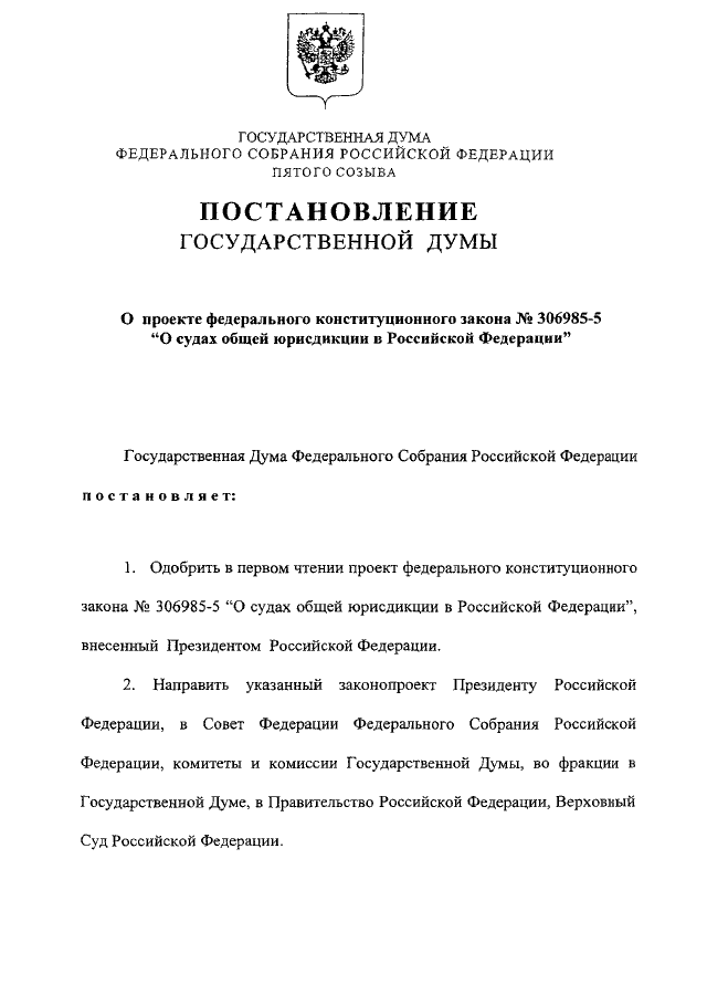 "О ПРОЕКТЕ ФЕДЕРАЛЬНОГО КОНСТИТУЦИОННОГО ЗАКОНА N 306985-5 "О СУДАХ ОБЩЕЙ ЮРИСДИКЦИИ В РОССИЙСКОЙ ФЕДЕРАЦИИ"
