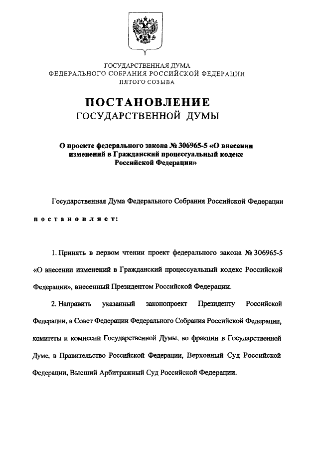 "О ПРОЕКТЕ ФЕДЕРАЛЬНОГО ЗАКОНА N 306965-5 "О ВНЕСЕНИИ ИЗМЕНЕНИЙ В ГРАЖДАНСКИЙ ПРОЦЕССУАЛЬНЫЙ КОДЕКС РОССИЙСКОЙ ФЕДЕРАЦИИ"