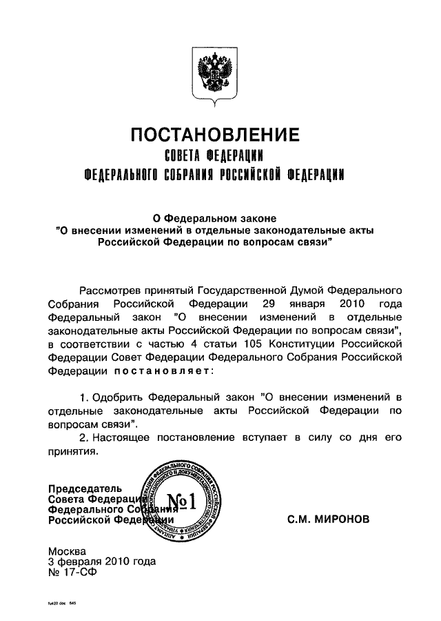ПОСТАНОВЛЕНИЕ СФ ФС РФ от 03.02.2010 N 17-СФ