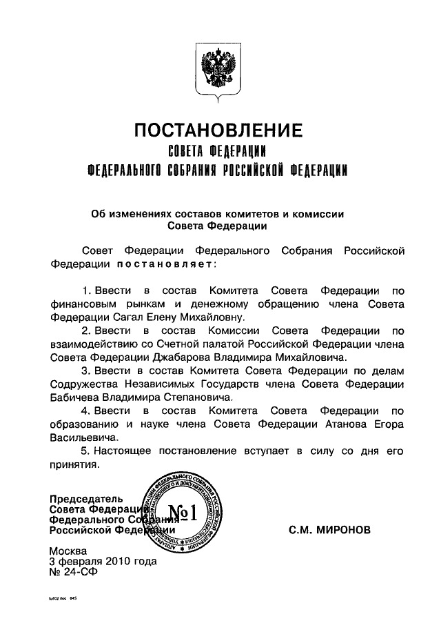 ПОСТАНОВЛЕНИЕ СФ ФС РФ от 03.02.2010 N 24-СФ
