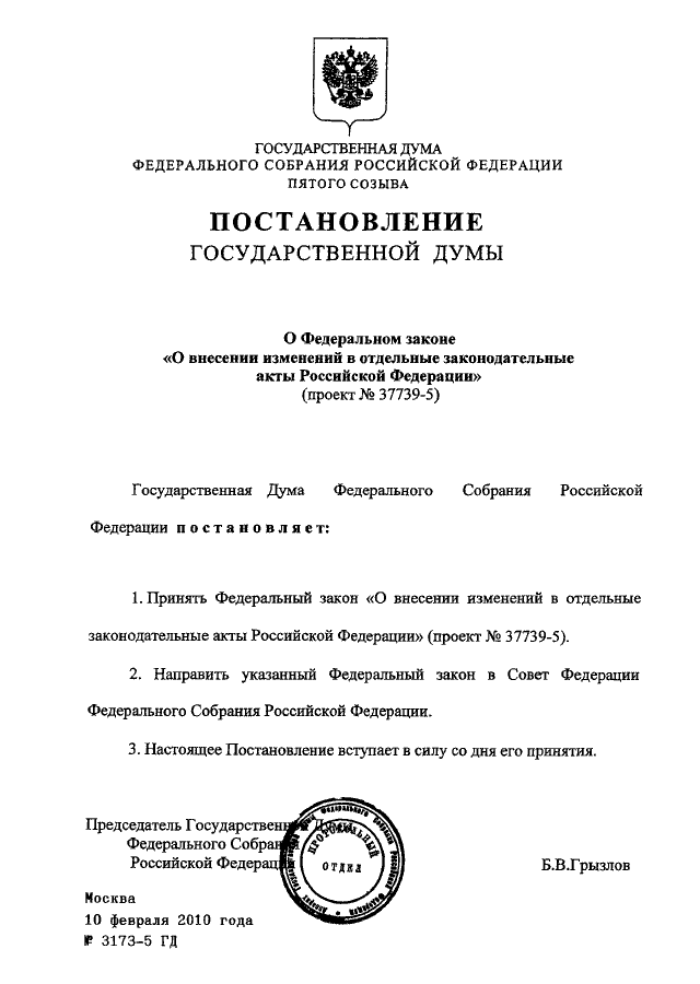ПОСТАНОВЛЕНИЕ ГД ФС РФ от 10.02.2010 N 3173-5 ГД