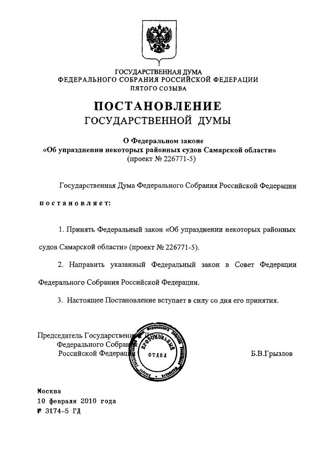 "О ФЕДЕРАЛЬНОМ ЗАКОНЕ "ОБ УПРАЗДНЕНИИ НЕКОТОРЫХ РАЙОННЫХ СУДОВ САМАРСКОЙ ОБЛАСТИ" (ПРОЕКТ N 226771-5)"