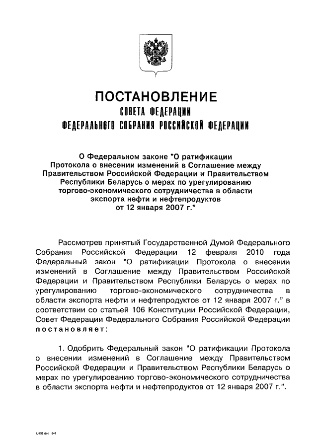 "О ФЕДЕРАЛЬНОМ ЗАКОНЕ "О РАТИФИКАЦИИ ПРОТОКОЛА О ВНЕСЕНИИ ИЗМЕНЕНИЙ В СОГЛАШЕНИЕ МЕЖДУ ПРАВИТЕЛЬСТВОМ РОССИЙСКОЙ ФЕДЕРАЦИИ И ПРАВИТЕЛЬСТВОМ РЕСПУБЛИКИ БЕЛАРУСЬ О МЕРАХ ПО УРЕГУЛИРОВАНИЮ ТОРГОВО - ЭКОНОМИЧЕСКОГО СОТРУДНИЧЕСТВА В ОБЛАСТИ ЭКСПОРТА НЕФТИ И НЕФТЕПРОДУКТОВ ОТ 12 ЯНВАРЯ 2007 Г."
