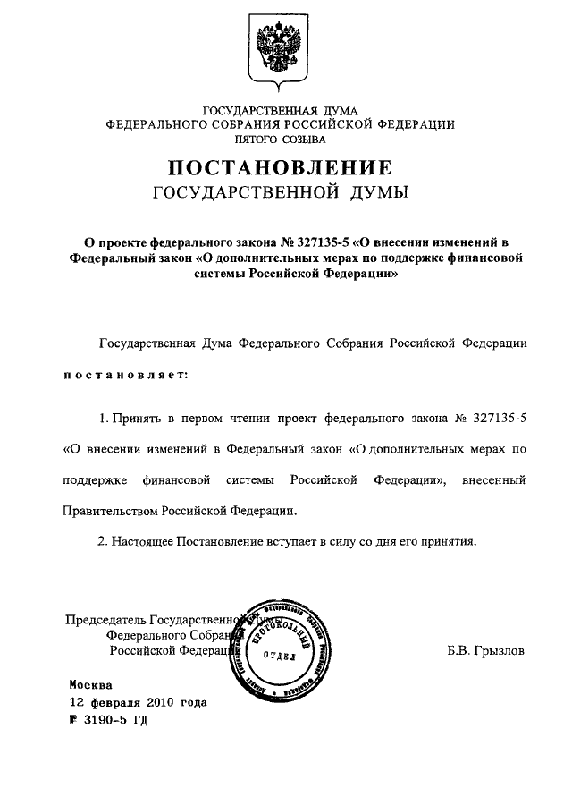 ПОСТАНОВЛЕНИЕ ГД ФС РФ от 12.02.2010 N 3190-5 ГД