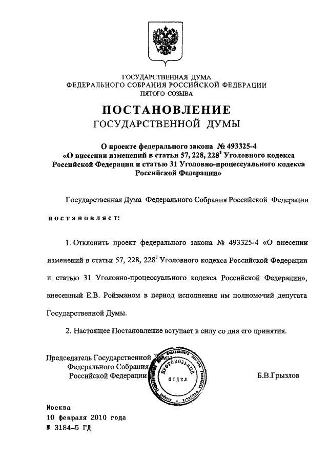 ПОСТАНОВЛЕНИЕ ГД ФС РФ от 10.02.2010 N 3184-5 ГД