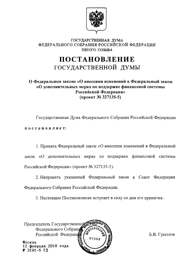 ПОСТАНОВЛЕНИЕ ГД ФС РФ от 12.02.2010 N 3191-5 ГД