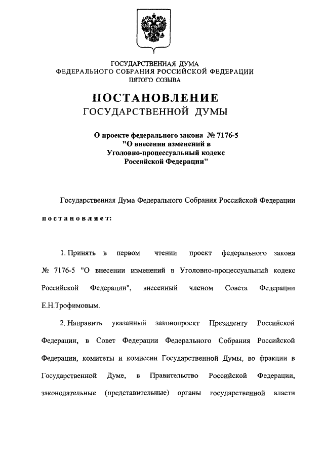 "О ПРОЕКТЕ ФЕДЕРАЛЬНОГО ЗАКОНА N 7176-5 "О ВНЕСЕНИИ ИЗМЕНЕНИЙ В УГОЛОВНО - ПРОЦЕССУАЛЬНЫЙ КОДЕКС РОССИЙСКОЙ ФЕДЕРАЦИИ"