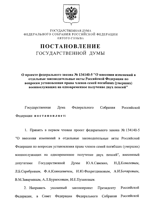 "О ПРОЕКТЕ ФЕДЕРАЛЬНОГО ЗАКОНА N 134140-5 "О ВНЕСЕНИИ ИЗМЕНЕНИЙ В