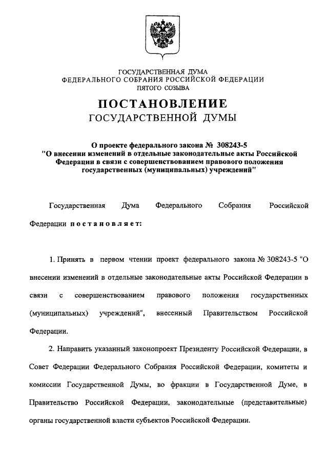 "О ПРОЕКТЕ ФЕДЕРАЛЬНОГО ЗАКОНА N 308243-5 "О ВНЕСЕНИИ ИЗМЕНЕНИЙ В