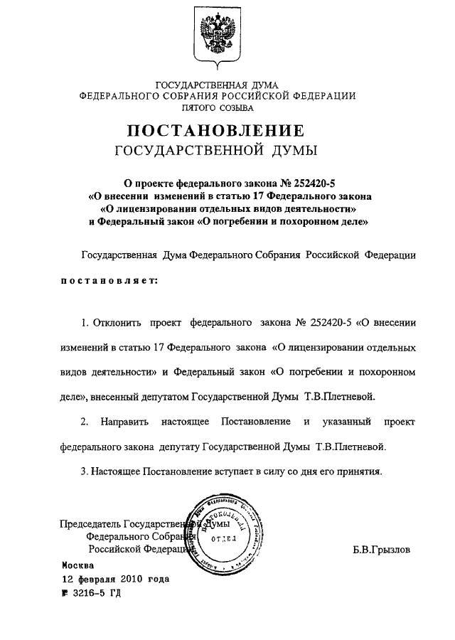 ПОСТАНОВЛЕНИЕ ГД ФС РФ от 12.02.2010 N 3216-5 ГД