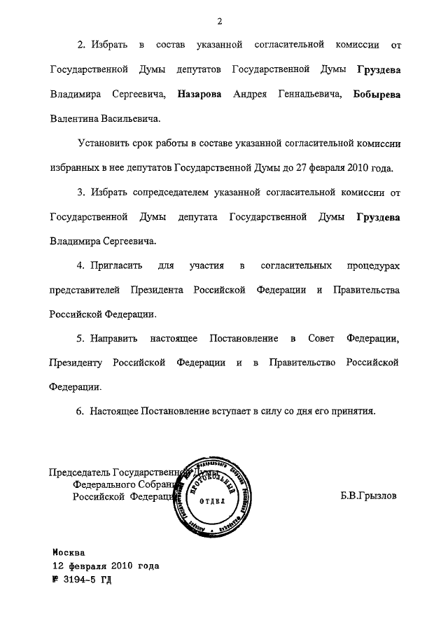 ПОСТАНОВЛЕНИЕ ГД ФС РФ от 12.02.2010 N 3194-5 ГД