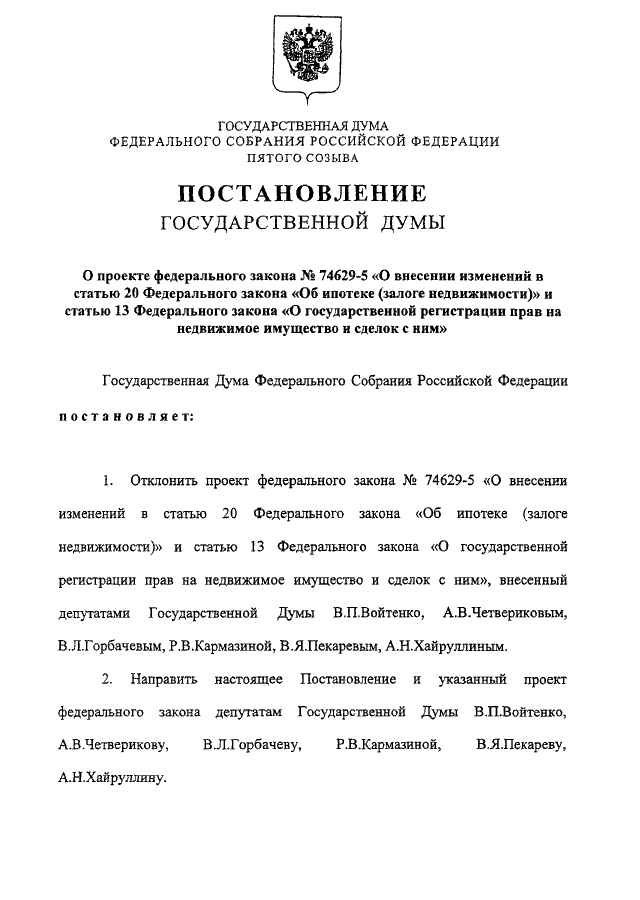 "О ПРОЕКТЕ ФЕДЕРАЛЬНОГО ЗАКОНА N 74629-5 "О ВНЕСЕНИИ ИЗМЕНЕНИЙ В