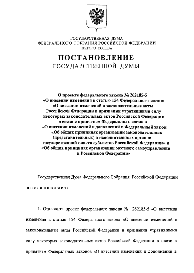 "О ПРОЕКТЕ ФЕДЕРАЛЬНОГО ЗАКОНА N 262185-5 "О ВНЕСЕНИИ ИЗМЕНЕНИЯ В СТАТЬЮ 154 ФЕДЕРАЛЬНОГО ЗАКОНА "О ВНЕСЕНИИ ИЗМЕНЕНИЙ В ЗАКОНОДАТЕЛЬНЫЕ АКТЫ РОССИЙСКОЙ ФЕДЕРАЦИИ И ПРИЗНАНИИ УТРАТИВШИМИ СИЛУ НЕКОТОРЫХ ЗАКОНОДАТЕЛЬНЫХ АКТОВ РОССИЙСКОЙ ФЕДЕРАЦИИ В СВЯЗИ С ПРИНЯТИЕМ ФЕДЕРАЛЬНЫХ ЗАКОНОВ "О ВНЕСЕНИИ ИЗМЕНЕНИЙ И ДОПОЛНЕНИЙ В ФЕДЕРАЛЬНЫЙ ЗАКОН "ОБ ОБЩИХ ПРИНЦИПАХ ОРГАНИЗАЦИИ ЗАКОНОДАТЕЛЬНЫХ (ПРЕДСТАВИТЕЛЬНЫХ) И ИСПОЛНИТЕЛЬНЫХ ОРГАНОВ ГОСУДАРСТВЕННОЙ ВЛАСТИ СУБЪЕКТОВ РОССИЙСКОЙ ФЕДЕРАЦИИ" И "ОБ ОБЩИХ ПРИНЦИПАХ ОРГАНИЗАЦИИ МЕСТНОГО САМОУПРАВЛЕНИЯ В РОССИЙСКОЙ ФЕДЕРАЦИИ"